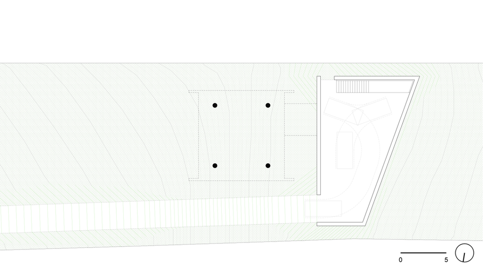 Decidiu-se por implantar a construção no limite da zona de preservação, a cerca de 40m do acesso, onde a casa está distante dos vizinhos e envolta por uma densa mata subtropical. Para isso, foi necessária a previsão de uma estrada em rampa ascendente que se encerra em um platô, ambos acessíveis por automóvel. Mais que um estacionamento, esse platô se constitui como uma área destinada a atividades ao ar livre: um pátio seco e horizontal em contraste com seu entorno íngreme, úmido e fechado pela vegetação. Com o intuito de alterar o mínimo a condição original do terreno, ele é a única intervenção na topografia. Uma escavação conforma seu recinto, ao passo que as pedras extraídas da movimentação do solo rochoso são usadas nos muros de contenção, adotando uma técnica comum na cultura construtiva local. A casa, por sua vez, é uma construção em concreto armado e alvenaria suspensa do solo e conectada ao platô por uma ponte, o que permite que a vegetação se desenvolva sob sua projeção.
